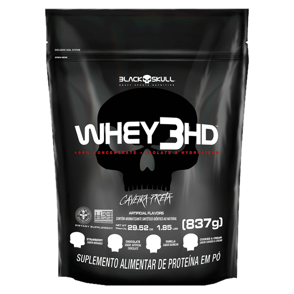 O WHEY 3HD BLACKSKULL USA apresenta um blend harmônico entre os três tipos de whey protein (WPC, WPI e WPH): WHEY PROTEIN CONCENTRADO (WPC): é obtido através do processo de ultra filtração do soro do leite. Nesse processo o soro passa por um filtro que segrega parte das moléculas menores como a lactose, gordura e resíduos, e concentra as maiores (proteínas). O WPC pode conter concentrações de proteína distintas, variando de 34% a 80%. O WPC contém gordura, lactose, carboidratos, fibras e minerais em sua composição. WHEY PROTEIN ISOLADO (WPI): por sua vez, o processo de extração da proteína do soro do leite que resulta no WPI é o de microfiltração, uma etapa posterior à de ultrafiltração. O processo de microfiltração remove os grandes glóbulos e moléculas de gordura, os quais são concentrados e separados dos demais componentes do soro de leite. Como consequência deste processo temos um produto com elevados teores proteicos (superiores a 90% de concentração) e baixos ou livres teores de lactose e gordura. WHEY PROTEIN HIDROLISADO (WPH): para chegar na proteína hidrolisada do soro do leite, o WPC ou WPI passam por um processo chamado hidrólise enzimática quebrando as moléculas de proteína em peptídeos menores, garantindo velocidade máxima de absorção. As proteínas são nutrientes chave para o período de recuperação quanto e ganho de massa muscular. As fontes possuem tempos de absorção diferentes mantendo os aminoácidos no sangue por tempo prolongado quando comparamos a um suplemento contendo apenas uma fonte de whey. São 32g de proteínas e 7,1g de BCAAs por dose que irão transformar seus objetivos em resultados.